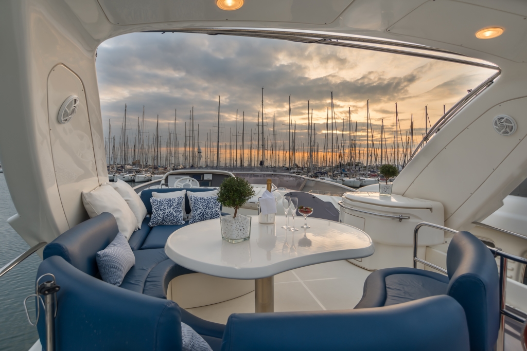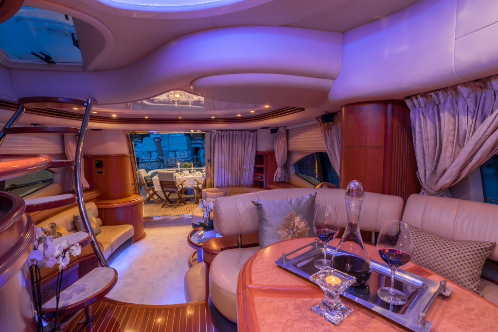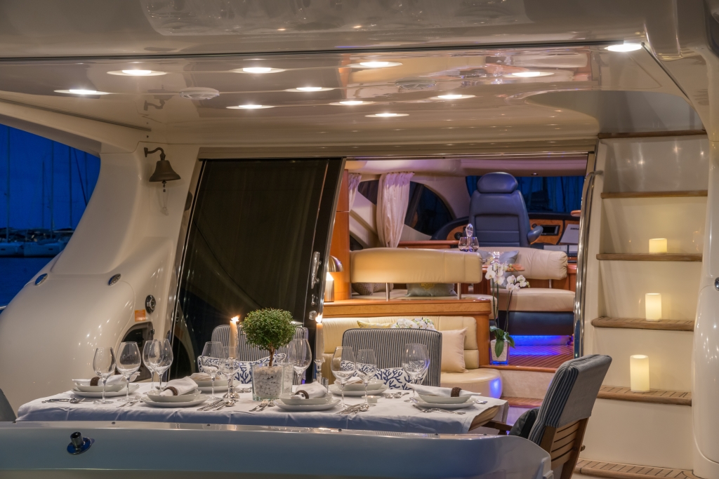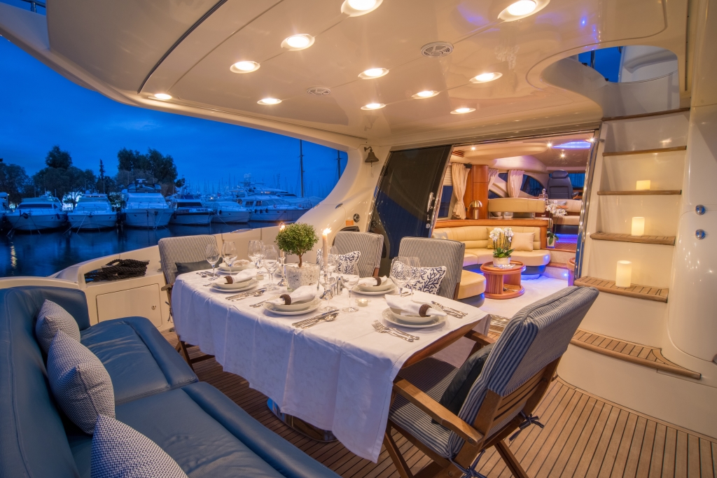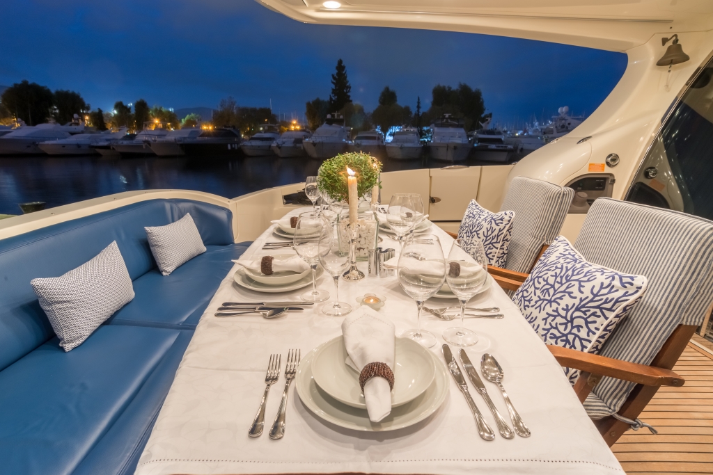 Όλες τις ώρες της ημέρας οι επισκέπτες συγκεντρώνονται γύρω από το οβάλ τραπέζι και απολαμβάνουν τον ήχο της θάλασσας ή τη ζωή στο λιμάνι. Αλλά και το καθιστικό στο πάνω κατάστρωμα είναι εξίσου χαρούμενο, καθώς και πιο ιδιωτικό και ήσυχο. Η θέα στη θάλασσα ή στο ηλιοβασίλεμα με την ευχάριστη παρέα προσφέρει την τέλεια πινελιά σε μια ιδανική μέρα. Οι επισκέπτες μπορούν επίσης να απολαύσουν την εμπειρία του μπάρμπεκιου σε αυτό το σαλόνι.